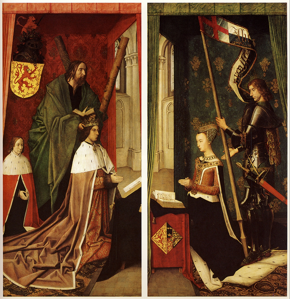 The reticulated and crowned headdress of Margaret of Denmark, Queen of Scotland. Altarpiece by Hugo van der Goes